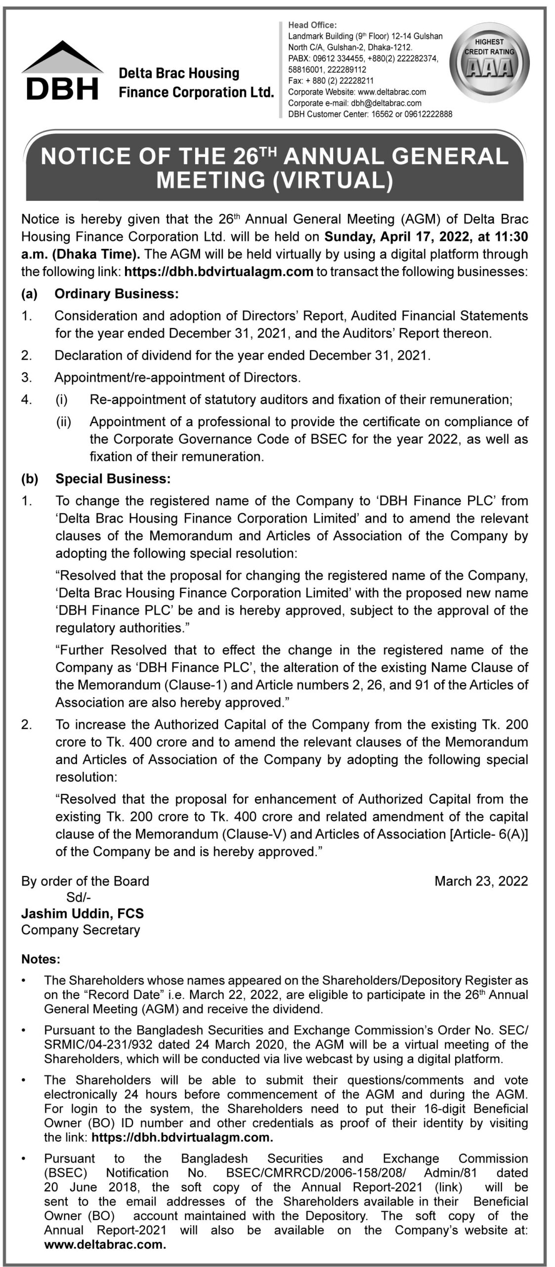 পিএসআই নিউজপ্রেস বিজ্ঞপ্তি “Delta Brac Housing Finance Corp Ltd. AGM Notice” March 23, 2022 Share on Facebook Tweet on Twitter tweet Delta Brac Housing Finance Corporation Ltd. AGM Notice. Delta Brac Housing Finance Corporation Ltd.