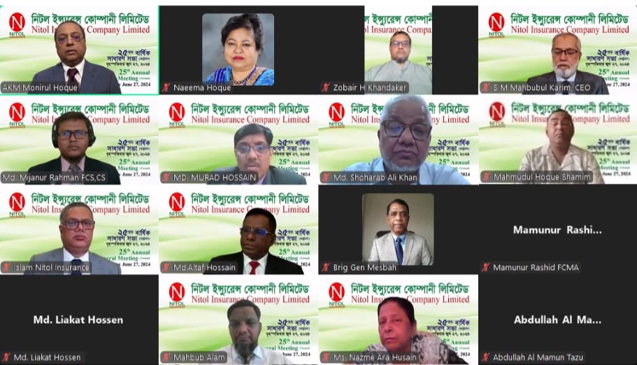 নিটল ইন্স্যুরেন্স কোম্পানী লিমিটেডের ২৫তম বার্ষিক সাধারণ সভা ২৭ই জুন, ২০২৪ইং তারিখে ভার্চুয়াল প্লাটফর্মের মাধ্যমে অনুষ্ঠিত হয়। সভায় সভাপতিত্ব করেন নিটল ইন্স্যুরেন্স কোম্পানী লিমিটেডের চেয়ারম্যান ও বাংলাদেশ ইন্স্যুরেন্স এসোসিয়েশনের ভাইস-প্রেসিডেন্ট জনাব এ কে এম মনিরুল হক। তিনি কোম্পানীর বিগত বৎসরের ব্যবসায়িক সাফল্য ও ভবিষ্যৎ কর্মপন্থা নিয়ে আলোকপাত করেন। সভায় কোম্পানীর ভাইস-চেয়ারম্যান জুবায়ের হুমায়ুন খন্দকার, পরিচালক নাঈমা হক, মাহমুদুল হক শামীম, পরিচালক নাজমে আরা হুসেন, মোঃ মুরাদ হোসেন, স্বতন্ত্র পরিচালক মোঃ মামুনুর রশিদ এফসিএমএ ও মোঃ সোহরাব আলী খান এফসিএমএ, মুখ্য নির্বাহী কর্মকর্তা এস এম মাহবুবুল করিম, প্রধান আর্থিক কর্মকর্তা মোঃ আলতাফ হোসেন এবং প্রধান অভ্যন্তরীন নিরীক্ষা ও কমপ্লায়েন্স কর্মকর্তা মোঃ লিয়াকত হোসেন এফসিএমএ উপস্থিত ছিলেন। সভা পরিচালনা করেন কোম্পানী সচিব মোঃ মিজানুর রহমান এফসিএস। সভায় ২০২৩ সালের বিনিয়োগকারীদের জন্য ১০.৫০% নগদ লভ্যাংশ অনুমোদন দেয়া হয়। বিপুল সংখ্যক শেয়ারহোল্ডারদের ভার্চুয়াল অংশগ্রহণের মধ্য দিয়ে সাধারণ সভা সফলতার সাথে অনুষ্ঠিত হয়।
