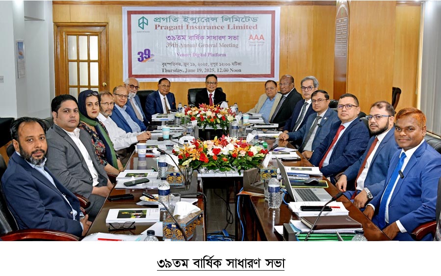প্রগতি ইন্সুরেন্স লিমিটেড এর ৩৯তম বার্ষিক সাধারণ সভা ১৯ জুন, ২০২৫ তারিখে ডিজিটাল প্লাটফর্মের মাধ্যমে অনুষ্ঠিত। সভায় শেয়ারহোল্ডারদের ২০২৪ সালের সমাপ্ত বছরের হিসাব বিবেচনার জন্য ২০% নগদ লভ্যাংশ এবং ৭% বোনাস শেয়ার অনুমোদন করা হয়। কোম্পানীর চেয়ারম্যান সৈয়দ এম. আলতাফ হোসাইন সভায় সভাপতিত্ব করেন। পরিচালক আলহাজ¦ খলিলুর রহমান, মোহাম্মদ আব্দুল আউয়াল, মো: সাইদুর রহমান, মোহাম্মদ আব্দুল মালেক, নাসির লতিফ, মো: মুসফিকুর রহমান, নিগার জাহান চৌধুরী, নাহরীন ইয়াহিয়া, সৈয়দ মোহাম্মদ জান, তাজওয়ার এম আউয়াল, স্বতন্ত্র পরিচালক মোহাম্মাদ জামাল উদ্দিন, হাসিনাতুন নাহার, মাহাবুব আনাম এবং কোম্পানীর উপদেষ্টা মোঃ রেজাউল করিম, মূখ্যনির্বাহী কর্মকর্তা সৈয়দ সেহাব উল্লাহ্ আল-মনজুর (এসিআইআই), মেজর সাদাত মো: মুসা পিএসসি (অব:) এ্যাডমিন এন্ড এইচআর চীফ ফিনানসিয়াল অফিসার অমর কৃষ্ণ শীল, এফসিএ, কোম্পানীসচিব মোহাম্মদ জাফর আলী, এফসিএসহ আরও অনেক শেয়ারহোল্ডার ডিজিটাল প্লাটফরমের মাধ্যমে ৩৯তম বার্ষিক সাধারণ সভায় যুক্ত হন। তারা তাদের মতামত জানান এবং ই-ভোটিং এর মাধ্যমে প্র¯তাবিত আলোচ্যসূচী সমুহের অনুমোদন করেন।