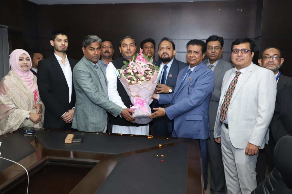 বাণিজ্য প্রতিমন্ত্রীকে সন্ধানী লাইফের প্রধান কার্যালয়ে ফুল দিয়ে বরন