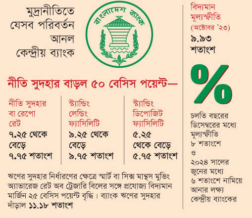 গত ২৬-১১-২০২৩ শনিবার সন্ধ্যায় কেন্দ্রীয় ব্যাংক থেকে জারীকৃত এ-সংক্রান্ত প্রজ্ঞাপনে বলা হয়, নীতি সুদহার করিডোরের ঊর্ধ্বসীমা স্ট্যান্ডিং লেন্ডিং ফ্যাসিলিটি (এসএলএফ) সুদহার ৯ দশমিক ২৫ শতাংশ থেকে বাড়িয়ে ৯ দশমিক ৭৫ শতাংশ নির্ধারণ করা হয়েছে। একই সঙ্গে নীতি সুদহার করিডোরের নিম্নসীমা স্ট্যান্ডিং ডিপোজিট ফ্যাসিলিটি (এসডিএফ) সুদহার ৫ দশমিক ২৫ শতাংশ থেকে বাড়িয়ে ৫ দশমিক ৭৫ শতাংশে পুনর্নির্ধারণ করা হয়। এছাড়া ঋণের সুদহার নির্ধারণের ক্ষেত্রে স্মার্ট বা সিক্স মান্থস মুভিং অ্যাভারেজ রেট অব ট্রেজারি বিলের সঙ্গে প্রযোজ্য বিদ্যমান মার্জিন আরো ২৫ বেসিস পয়েন্ট বাড়ানো হয়েছে। আজ থেকে এসব সিদ্ধান্ত কার্যকর হবে।