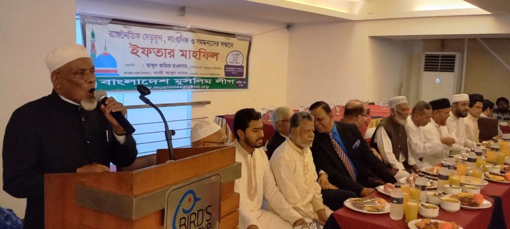 সারা বিশ্বে সাধারণ মুসলমানদের উপর আজ ভয়াবহ দমন-পীড়ন চলছে। ফিলিস্তিন, আফগানিস্তান, ইরাক, ইরান, প্যালেস্টাইন, সিরিয়া, মিসর, মিয়ানমার, চীন, ভারত সর্বত্রই। ভারতীয় উপমহাদেশের প্রেক্ষাপটে ১৯৪৭ সালে ফলপ্রসূ হিসাবে প্রমাণিত নবাব সলিমুল্লার প্রদর্শিত রাজনৈতিক দর্শন মুসলিম জাতিসত্তার ভিত্তিতে ঐক্যবদ্ধ মুসলিম বিশ্ব হতে পারে এ অন্যায় থেকে মুক্তির মূলমন্ত্র। ওআইসি সহ বিশ্ব মুসলিম নেতৃবৃন্দের এ বিষয়ে নতুন করে ভাবার সময় এসেছে। আজ (০১ এপ্রিল, ২০২৪) বিকল ০৪.০০টায় পল্টনস্থ বার্ডস আই কনভেনশন হলে বাংলাদেশ মুসলিম লীগ আয়োজিত ইফতার মাহফিলে ইফতার পূর্ব সংক্ষিপ্ত আলোচনায় উপস্থিত নেতৃবৃন্দ উপরোক্ত মন্তব্য করেন। দলের নির্বাহী সভাপতি আব্দুল আজিজ হাওলাদারের সভাপতিত্বে ও দলীয় মহাসচিব কাজী আবুল খায়েরের সার্বিক পরিচালনায় অনুষ্ঠানে আরও উপস্থিত ছিলেন, বিএনপির যুগ্ম সম্পাদক ব্যারিষ্টার মাহবুব উদ্দিন খোকন, বাংলাদেশ জামায়াতে ইসলামী নেতা মাওলানা আব্দুল হালিম ও মাওলানা শামীম সাইদী, এনপিপি সভাপতি ড. ফরিদুজ্জামান ফরহাদ, বাংলাদেশ জাতীয় পার্টির প্রেসিডিয়াম সদস্য , গণঅধিকার পরিষদের সদস্য সচিব ফারুক হাসান, , লেবার পার্টির চেয়ারম্যান মোস্তাফিজুর রহমান ইরান, জাগপা সহ সভাপতি রাশেদ প্রধান, বিশিষ্ঠ সাংবাদিক মোস্তফা কামাল মজুমদার, এনডিএম চেয়ারম্যান ববি হাজ্জাজ, গণঅধিকার পরিষদের সভাপতি নুরুল হক নূর, খেলাফত মজলিসের নায়েবে আমীর মাওলানা আহমেদ আলী কাসেমী, বাংলাদেশ ন্যাপ চেয়ারম্যান এন.এম শাওন সাদেকী, জাগপা সভাপতি খন্দকার লুৎফর রহমান গণদলের চেয়ারম্যান গোলাম মাওলা চৌধুরী, বিএনপি নির্বাহী কমিটির সদস্য এড. আবেদ রাজা, এবি পার্টির যুগ্ম মহাসচিব ব্যরিষ্টার আসাদুজ্জামান ফুয়াদ,গনফ্রন্ট্রের মহাসচিব আহম¥দ আলী শেখ, এনডিপির মহাসচিব মঞ্জুর হোসেন ঈসা, বাংলাদেশ ন্যাপ মহাসচিব গোলাম মোস্তফা ভূঁইয়া, ইসলামী আন্দোলন দফতর সম্পাদক মাওলানা লোকমান হোসাইন জাফরী, দেশ বাঁচাও মানুষ বাঁচাও সভাপতি কে.এ রকিবুল ইসলাম রিপন, লেবার পার্টি একাংশের চেয়ারম্যান লায়ন ফারুক রহমান প্রমুখ। দলীয় নেতৃবৃন্দের মধ্যে দলের স্থায়ী কমিটির সদস্য আতিকুল ইসলাম, আনোয়ার হোসেন আবুড়ী, সহ-সভাপতি নজরুল ইসলাম, এ্যাড. আফতাব হোসেন মোল্লা ও সৈয়দ আব্দুল হান্নান নূর, অতিরিক্ত মহাসচিব আকবর হোসেন পাঠান, দফতর সম্পাদক খোন্দকার জিল্লুর রহমান, খান আসাদ প্রমুখ।