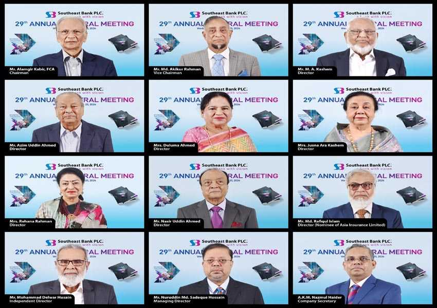 সাউথইস্ট ব্যাংক পিএলসির ২৯তম বার্ষিক সাধারণ সভা (এজিএম) বুধবার (২৫ সেপ্টেম্বর) ডিজিটাল প্ল্যাটফর্মে অনুষ্ঠিত হয়েছে।