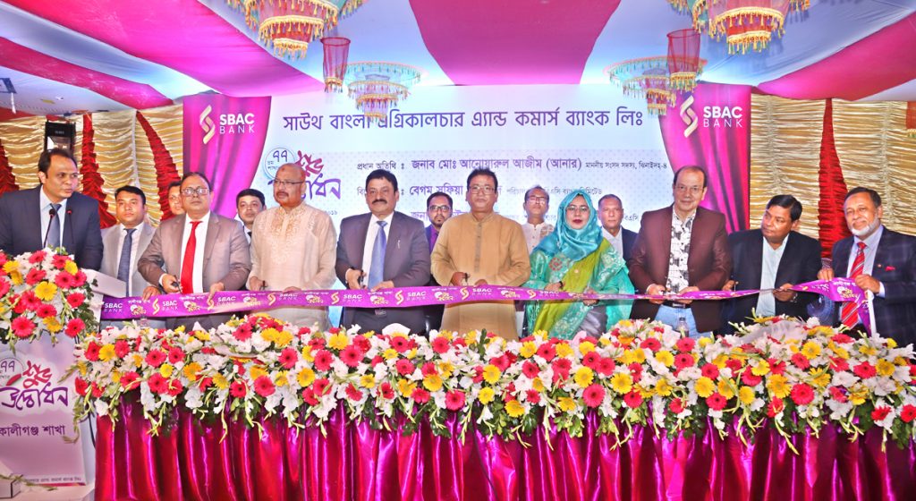 ঝিনাইদহ্্ জেলার কালীগঞ্জে সাউথ বাংলা এগ্রিকালচার এ্যান্ড কমার্স (এসবিএসি) ব্যাংক লিমিটেডের ৭৭তম শাখার কার্যক্রম শুরু হয়েছে। এ উপলক্ষ্যে আয়োজিত এক অনুষ্ঠানে প্রধান অতিথি ছিলেন ঝিনাইদহ্্-৪ আসনের সংসদ সদস্য মোঃ আনোয়ারুল আজীম (আনার)। কালীগঞ্জ বাজার রোডের রহমানিয়া সুপার মার্কেটে ব্যাংকের শাখা চত্বরে অতিরিক্ত ব্যবস্থাপনা পরিচালক মোস্তফা জালাল উদ্দিন আহমেদের সভাপতিত্বে অনুষ্ঠানে বিশেষ অতিথি ছিলেন সাবেক সংসদ সদস্য আব্দুল মান্নান, কালীগঞ্জ পৌরসভার মেয়র আশরাফুল আলম আশরাফ, ব্যাংকের পরিচালক বেগম সুফিয়া আমজাদ, স্পন্সর শেয়ারহোল্ডার ও সাবেক পরিচালক মতিউর রহমান। বক্তব্য রাখেন ব্যাংকের উপব্যবস্থাপনা পরিচালক মোঃ মামুনুর রশিদ মোল্লা, মোবারকগঞ্জ সুগার মিলসের ব্যবস্থাপনা পরিচালক মোঃ আনোয়ার কবির, ব্যাংকের এসইভিপি মোঃ হাফিজুর রহমান প্রমুখ। এসময়ে ব্যাংকের কোম্পানি সেক্রেটারি মোঃ মোকাদ্দেস আলীসহ এলাকার বিশিষ্ট ব্যবসায়ী ও গণ্যমান্য ব্যক্তিবর্গ। শেষে ধন্যবাদ জ্ঞাপন করেন- ব্যাংকের এফভিপি ও কালীগঞ্জ শাখার ব্যবস্থাপক বিধান কুমার সাহা।