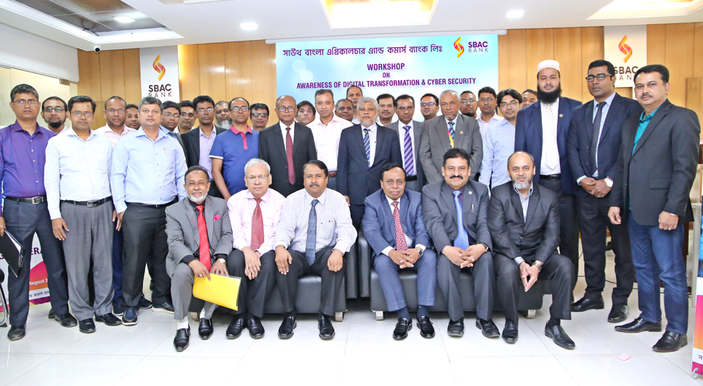 South Bangla Agriculture & Commerce (SBAC) Bank IT Division organized a training workshop on ‘Awareness of Digital Transformation & Cyber Security’ at its Head Office on Saturday August 24, 2019. The Bank’s Managing Director and CEO, Md. Golam Faruque posed for photography with participants after inauguration of the workshop. While, Additional Managing Director Mostafa Jalal Uddin Ahmed, Deputy Managing Director Tariqul Islam Chowdhury, SBAC Bank Training Institute Principal Md. Nazrul Islam, IT Head Md. Mizanur Rahman and Others Divisional Heads were present in the workshop.