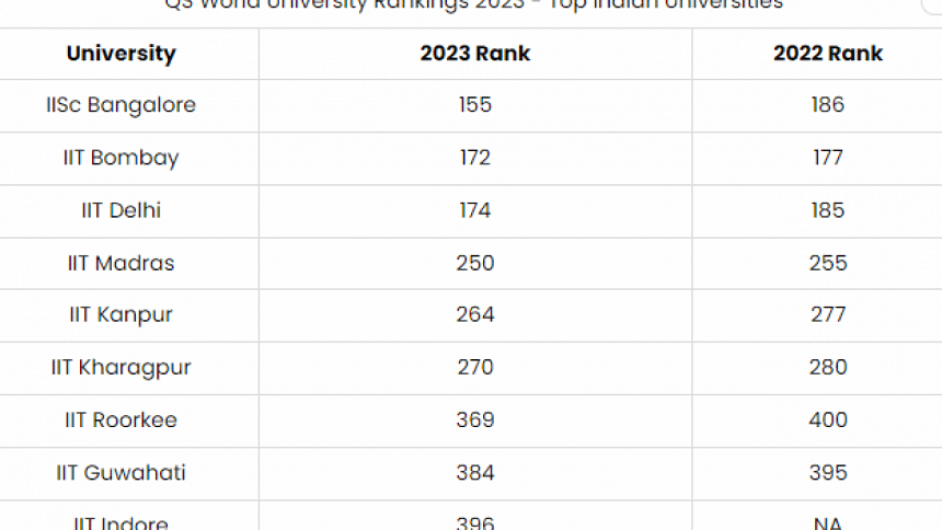 এ বছর প্রতিবেশী দেশ ভারতের ৯টি প্রতিষ্ঠান বিশ্বের সেরা ৫০০ বিশ্ববিদ্যালয়ের মধ্যে রয়েছে। সেগুলোর মধ্যে ইন্ডিয়ান ইনস্টিটিউট অব সাইন্সের অবস্থান ১৫৫তম, যেটি গতবার ছিল ১৮৬।
