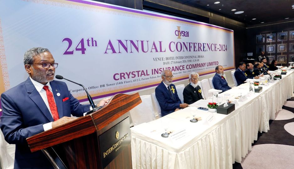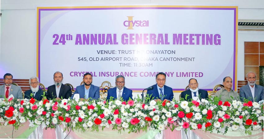পুঁজিবাজারে তালিকাভুক্ত ক্রিস্টাল ইন্স্যুরেন্স কোম্পানির লিমিটেডের ২৪তম বার্ষিক সাধারণ সভা (এজিএম) ৩১ মার্চ রোববার হাইব্রিড পদ্ধতিতে ট্রাস্ট মিলনায়তনে অনুষ্ঠিত হয়। সভায় সভাপতিত্ব করেন কোম্পানির চেয়ারম্যান আব্দুল্লাহ আল মাহমুদ (মাহিন)। শেয়ারহোল্ডারদের অংশগ্রহণে ২০২৩ সালের জন্য ১০% স্টক ও ৭% শতাংশ নগদ লভ্যাংশ অনুমোদনসহ আর্থিক প্রতিবেদন অনুমোদন পরিচালক পরিষদের প্রতিবেদন, স্থিতিপত্র, লাভ লোকসান হিসাব ও অডিট প্রতিবেদন, পরিচালক নির্বাচন, অডিটর নিয়োগ ও পারিশ্রমিক নির্ধারণ শেয়ারহোল্ডারদের সর্বসম্মতিক্রমে অনুমোদিত হয়।