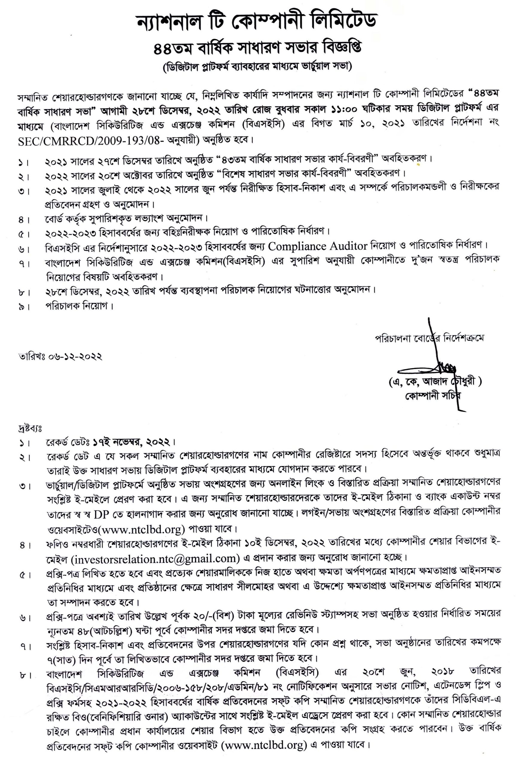 ৪৪তম বার্ষীক সাধার সভার বিজ্ঞপ্তি, ন্যাশনাল টি কোম্পানী লিমিটিড