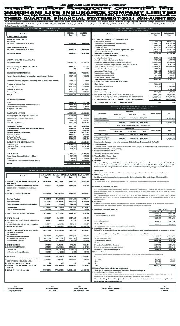 পিএসআই নিউজ 3rd Quarter Financial Statement 2021 of Sandhani Life Insurance Co. Ltd October 28, 2021 Share on Facebook Tweet on Twitter tweet 3rd Quarter Financial Statement 2021