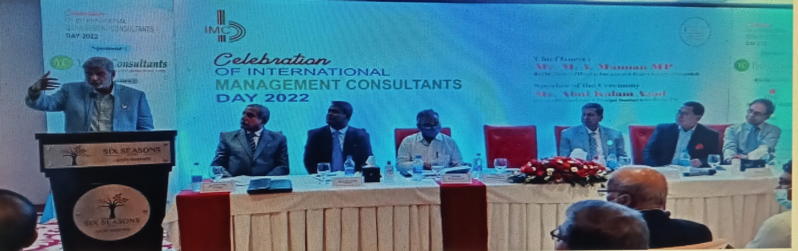 Mr. M A Mannan, MP, Hon’ble Minister for Planning, Govt. of Bangladesh addressing the Ceremony ofthe International Management Consultants Day as the Chief Guest. Mr. Abul Kalam Azad, Former SDG Coordinator and Principal Secretary to the Hon'ble Prime Minister spoke as the Main Speaker of the Ceremony, Prof. Dr. Abdur Rab, Chief Advisor of IMCB & VC, IUBAT and Mr. M Zakir Hossain, Chairman of IMCB are seen in the picture.