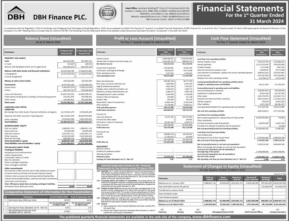 পিএসআই নিউজ DBH Finance PLC. 1st Quarter Financial Statements May 5, 2024 Share on Facebook Tweet on Twitter tweet DBH Finance PLC. Financial Statements For the 1st Quarter ended 31 March 2024