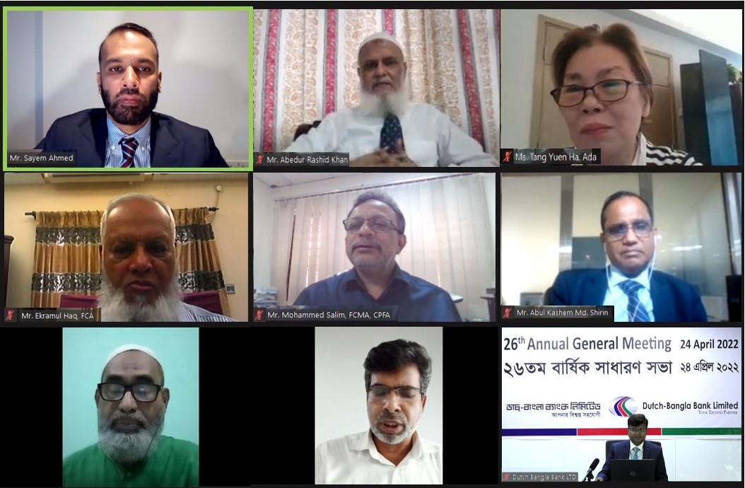 ডাচ-বাংলা ব্যাংক লিমিটেড-এর ২৬তম বার্ষিক সাধারণ সভা ব্যাংকের চেয়ারম্যান সায়েম আহমেদ এর সভাপতিত্বে ২৪ এপ্রিল ২০২২ ইং তারিখে সকাল ১১:০০ ঘটিকায় ভার্চুয়াল প্লাটফর্মের মাধ্যমে অনুষ্ঠিত হয়। বার্ষিক সাধারণ সভার শুরুতে চেয়ারম্যান মহোদয় তাঁর সংক্ষিপ্ত বক্তব্যে সম্মানিত শেয়ারহোল্ডারবৃন্দকে শুভে”ছা জানান।