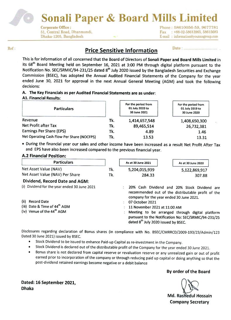 পিএসআই নিউজ Price Sensitive Information of Sonali Paper & Board Mills Ltd. September 16, 2021 Share on Facebook Tweet on Twitter tweet