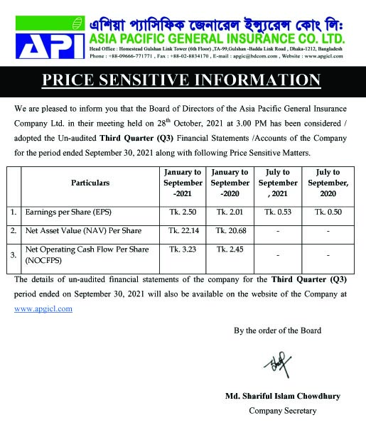 বোর্ড সভা Price Sensitive Information on Q3 Asia Pacific General Insurance Co. Ltd October 28, 2021 Share on Facebook Tweet on Twitter tweet Price Sensitive Information on Q3 Asia Pacific General Insurance Co. Ltd
