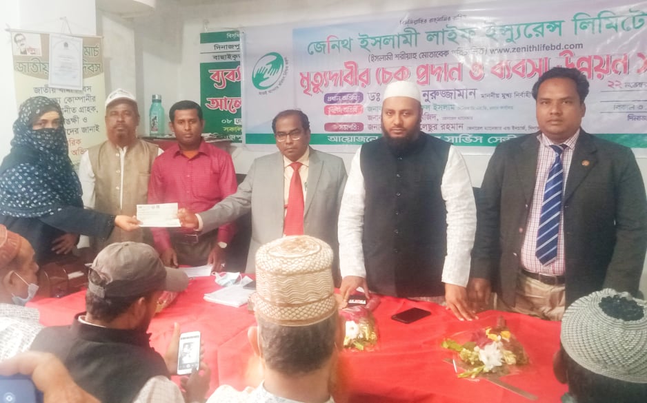 দিনাজপুরে জেনিথ লাইফের মৃত্যুদাবি চেক প্রদান অনুষ্ঠান দিনাজপুরে জেনিথ ইসলামী লাইফ ইন্সুইরেন্স লিমিটেডের গ্রাহকের মৃত্যুদাবি চেক প্রদান ব্যবসা উন্নয়ন সভা অনুষ্ঠিত হয়েছে। সোমবার (২২ নভেম্বর) বিকেল ৪টায় স্থানীয় অফিসে এই সভা অনুষ্ঠিত হয়। কোম্পানির জেনারেল ম্যানেজার মখলেছুর রহমানের সভাপতিত্বে প্রধান অতিথির বক্তব্য দেন, কোম্পানির মূখ্য নির্বাহী কর্মকর্তা এসএম নূরুজ্জামান। বিশেষ অতিথির বক্তব্য রাখেন, সিনিয়র জেনারেল ম্যানেজার মুহাম্মদ কামরুল ইসলাম, জেনারেল ম্যানেজার আব্দুল মজিদ। আয়োজিত এই উন্নয়ন সভায় দিনাজপুর অফিসের বাছাইকৃত উন্নয়ন কর্মকর্তাগণ অংশ গ্রহন করেন। অনুষ্ঠানে মরহুম গ্রাহক জাহিদুল ইসলামের নমিনির ২লক্ষ ৪৮ হাজার টাকার চেক প্রদান করা হয়। তিনি ২২ হাজার ৩৬০ টাকার দু’টি কিস্তি দিয়ে মৃত্যুবরণ করেন।