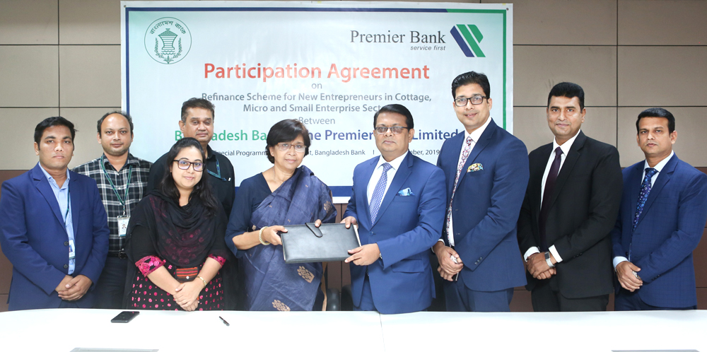 Premier Bank Limited has signed an agreement with Bangladesh Bank Refinance Scheme for New Entrepreneurs in Cottage, Micro and Small Enterprise Sector to support the development of the new entrepreneurs. Mrs. Laila Rashid, General Manager- SME & Special Programmes Department, Bangladesh Bank and Mr. M. Reazul Karim, Managing Director & CEO of Premier Bank Limited signed the agreement on behalf of respective institutions. Mr. Mohammed Emtiaz Uddin, Head of SME & Agriculture, Premier Bank and senior officials of Bangladesh Bank also present in the program.