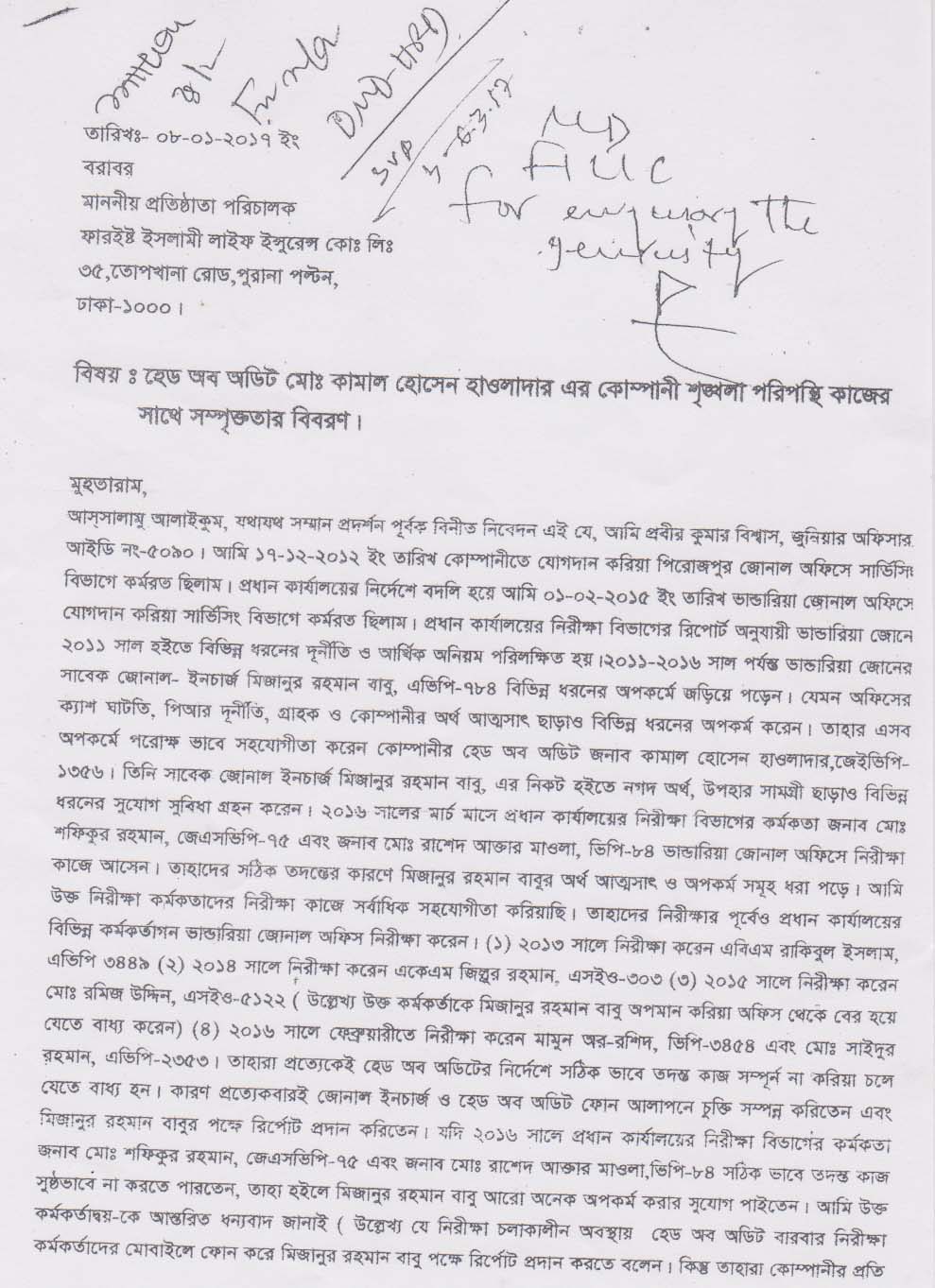 ফারইস্ট ইসলামী লাইফের হেড অব অডিট মোঃ কামাল হোসেন হাওলাদার, জেইভিপি-১৩৬৫, এর সহযোগিতায় বান্ডারিয়া জোনের ইনচার্জ মিজানুর রহমান বাবু,এভিপি-৭৮৪,২০১১ সাল থেকে ২০১৬ সাল পর্যন্ত এর অপকর্মের প্রমানে বুঝা যায় ফারইস্ট ইসলামী লাইফের কর্মকর্তাগন এহেন কোন দুর্নীতি নাই যা তারা করেন নাই।