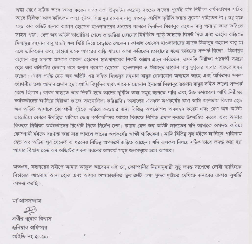 দাখিলকৃত বিবরন অনুযায়ী ২০১৬ সালের মার্চ মাসে প্রধান কার্যালয়ের নিরীক্ষা বিভাগের কর্মকর্তা শফিকুর রহমান,জেএসভিফি-৭৫, এবং রাশেদ আক্তার মাওলা,ভিফি-৮৪, ভান্ডারিয়া জোনাল অফিস পরীক্ষা করে ইনচার্জ মিজানুর রহমান বাবু, এভিপি-৭৮৪, এর বিপুল অপকর্মের প্রমান পান। অতিতেও ইনচার্জ মিজানুর রহমান বাবু, নিজের অপকর্ম ঢাকার জন্য ২০১৩ সালে নিরীক্ষক এবিএম রফিকুল ইসলাম,এভিপি- ৩৪৪৯কে, ২০১৪ সালে নিরীক্ষক একেএম জিল্লুর রহমান,এসইও-৩০৩ কে, এবং ২০১৫ সালে নিরীক্ষক রমিজ উদ্দিন,এসইও-৫১২২, কে অবৈধ প্রভাব খাটিয়ে অপমান করে অফিস থেকে বের করে দেন। প্রত্যেকবারই জোনাল ইনচার্জ এবং হেড অব অডিট মোঃ কামাল হোসেন হাওলাদারের জোগসাজসে সমস্থ অপকর্ম ও অর্থ আত্মসাতের বলয় তৈরি করে রেখেছিলেন, যা ২০১৬ সালে প্রধান কার্যালয়ের নিরীক্ষা বিভাগের কর্মকর্তা শফিকুর রহমান, জেএসভিপি-৭৫, এবং মোঃ রশেদ আক্তার মাওলা, ভিপি-৮৪, এর সঠিক তদন্তে ধরা পড়ে। তদন্তকালে হেড অব অডিট মোঃ কামাল হোসেন হাওলাদার নিজের ধরাপড়া অপকর্ম ঢাকার জন্য তদন্ত কর্মকর্তাদ্বয়কে জোনাল ইনচার্জ মিজানুর রহমান বাবুর উপর দোষ চাপানোর জন্য উঠেপড়ে চেষ্টা করেও ব্যার্থ হন। এমএ খালেকের প্রত্যয়ন করা প্রতিবেদন অনুযায়ী তার প্রমান দেখা যায় । (প্রতিবেদনের ও পরবর্তিতে হেড অব অডিটকে এসব অভিযোগ থেকে অব্যাহতি পত্রের স্কেন কপি তুলে দেওয়া হল)