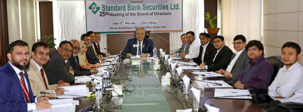 স্ট্যান্ডার্ড ব্যাংক সিকিউরিটিজ লিমিটেড এর ২৫তম বোর্ড সভা ১৭ জুলাই ২০১৯ তারিখে ব্যাংকের প্রধান কার্যালয়ে সম্মানিত চেয়ারম্যান জনাব কাজী আকরাম উদ্দিন আহমদ এর সভাপতিত্বে অনুষ্ঠিত হয়। উক্ত সভায় উপস্থিত ছিলেন পরিচালনা পর্ষদের সম্মানিত সদস্য জনাব এস. এ. এম. হোসাইন, মোঃ জাহেদুল হক, মামুন-উর-রশিদ, তানভীর মোস্তফা চৌধুরী, বেদৌরা আহমেদ সালাম, এ. কে. এম. আবদুল আলিম, আজাদ আহমেদ, জাহেদুল আলম, মোঃ আরিফ চৌধুরী, কাজী সানাউল হক, নজমুল হক চৌধুরী, ব্যাংকের অতিরিক্ত ব্যবস্থাপনা পরিচালক জনাব মোঃ তারিকুল আজম এবং উপ ব্যবস্থাপনা পরিচালক জনাব মোঃ মোতালেব হোসেন।