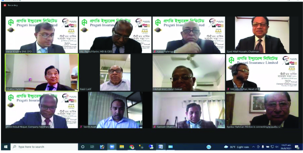 প্রগতি ইন্সুরেন্স লিমিটেড এর ৩৫ তম বার্ষিক সাধারন সভা ২৬ আগষ্ট, ২০২১ তারিখে ডিজিটাল প্লাটফরমের মাধ্যমে অনুষ্ঠিত। এই সভায় কোম্পানীর শেয়ারহোল্ডারদের ২০২০ সালের জন্য ৩০% নগদ লভ্যাংশ অনুমোদন করা হয়। কোম্পানীর চেয়ারম্যান সৈয়দ এম আলতাফ হোসাইন এই সভায় সভাপতিত্ব করেন। ভাইস চেয়ারম্যান জনাব তাবিদ মোঃ আউয়াল এবং কোম্পানীর পরিচালনা পর্ষদের সদস্য সর্বজনাব আব্দুল আউয়াল মিন্টু, খলিলুর রহমান, মোহা¤মদ এ. আউয়াল, মোঃ সাইদুর রহমান মিন্টু, এন.জে চৌধুরী, মোহাম্মাদ আব্দুল মালেক, নাসির লতিফ, স্বতন্ত্র পরিচালক সন্তোষ শর্মা, হাসিনাতুন নাহার এবং প্রধান নির্বাহী কর্মকর্তা জনাব মোঃ রেজাউল করিম সহ আরো অনেকে ৩৫তম বার্ষিক সাধারণ সভায় বিপুল সংখ্যক শেয়ারহোল্ডার ডিজিটাল প্লাটফরমে যুক্ত হন। তারা তাদের মতামত জানান এবং ই-ভোটিং এর মাধ্যমে প্রস্তাবিত আলোচ্যসূচী সমুহের অনুমোদন করেন।