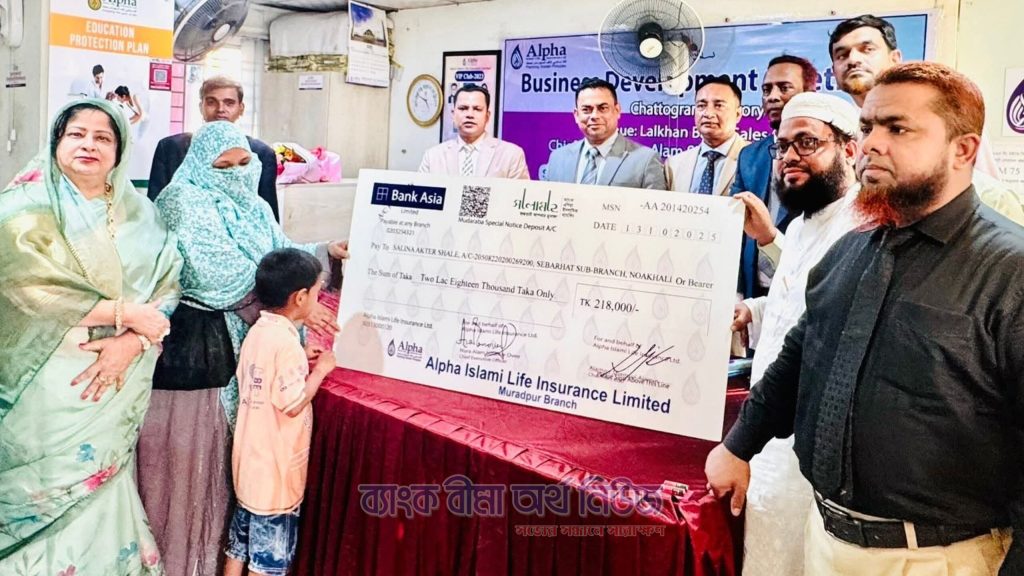 আলফা ইসলামী লাইফ ইন্স্যুরেন্স লিঃ মুরাদপুর-চট্টগ্রাম সেলস্ অফিসের সম্মানিত গ্রাহক আনোয়ার আজম খান এর মৃত্যু দাবীর চেক তার মনোনীতক স্ত্রীর হাতে তুলে দেন কোম্পানির মুখ্য নির্বাহী কর্মকর্তা নূরে আলম ছিদ্দিকি অভি। অনুষ্ঠানে আরো উপস্থিত ছিলেন সেলস ম্যানেজার সায়ের আহমদ সায়েদ।