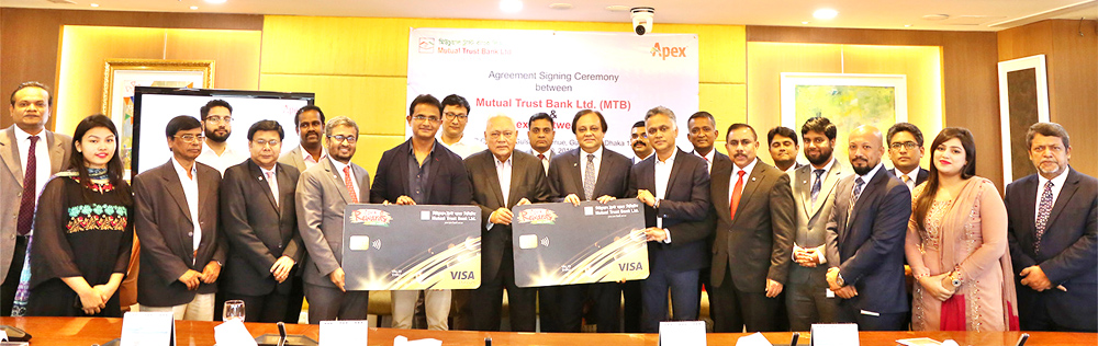 মিউচুয়াল ট্রাস্ট ব্যাংক লিমিটেড (এমটিবি) এবং এ্যাপেক্স ফুটওয়্যার লিমিটেড সম্প্রতি এ্যাপেক্স রিওয়ার্ড গোল্ড মেম্বারদের জন্য বিশেষ সুবিধাসম্বলিত কো-ব্র্যান্ডেড ভিসা প্লাটিনাম ক্রেডিট কার্ড-এর প্রচলন করে। গত জুলাই ৩০, ২০১৯ তারিখে এমটিবি’র প্রধান কার্যালয়, এমটিবি সেন্টার, গুলশান ১, ঢাকা-এ এই উপলক্ষে এক সমঝোতা চুক্তি স্বাক্ষরিত হয়। এর মাধ্যমে এ্যাপেক্স রিওয়ার্ড গোল্ড মেম্বাররা এমটিবি ভিসা প্লাটিনাম ক্রেডিট কার্র্ড-এর উপর বিশেষ সুবিধা যেমন: হ্রাসকৃত মূল্যে পণ্য ক্রয়, বিনামূল্যে এমটিবি এয়ার লাউঞ্জ ব্যবহার, ফ্রি ইন্সুরেন্সসহ আরো অনেক সুবিধা উপভোগ করতে পারবেন। এ্যাপেক্স ফুটওয়্যার লিমিটেড-এর ব্যবস্থাপনা পরিচালক, সৈয়দ নাসিম মঞ্জুর এবং এমটিবি’র ব্যবস্থাপনা পরিচালক ও প্রধান নির্বাহী, আনিস এ. খান, সৈয়দ মঞ্জুর এলাহী, চেয়ারম্যান, এ্যাপেক্স ফুটওয়্যার লিমিটেড-এর উপস্থিতিতে, নিজ নিজ প্রতিষ্ঠানের পক্ষে চুক্তিপত্রে স্বাক্ষর করেন।