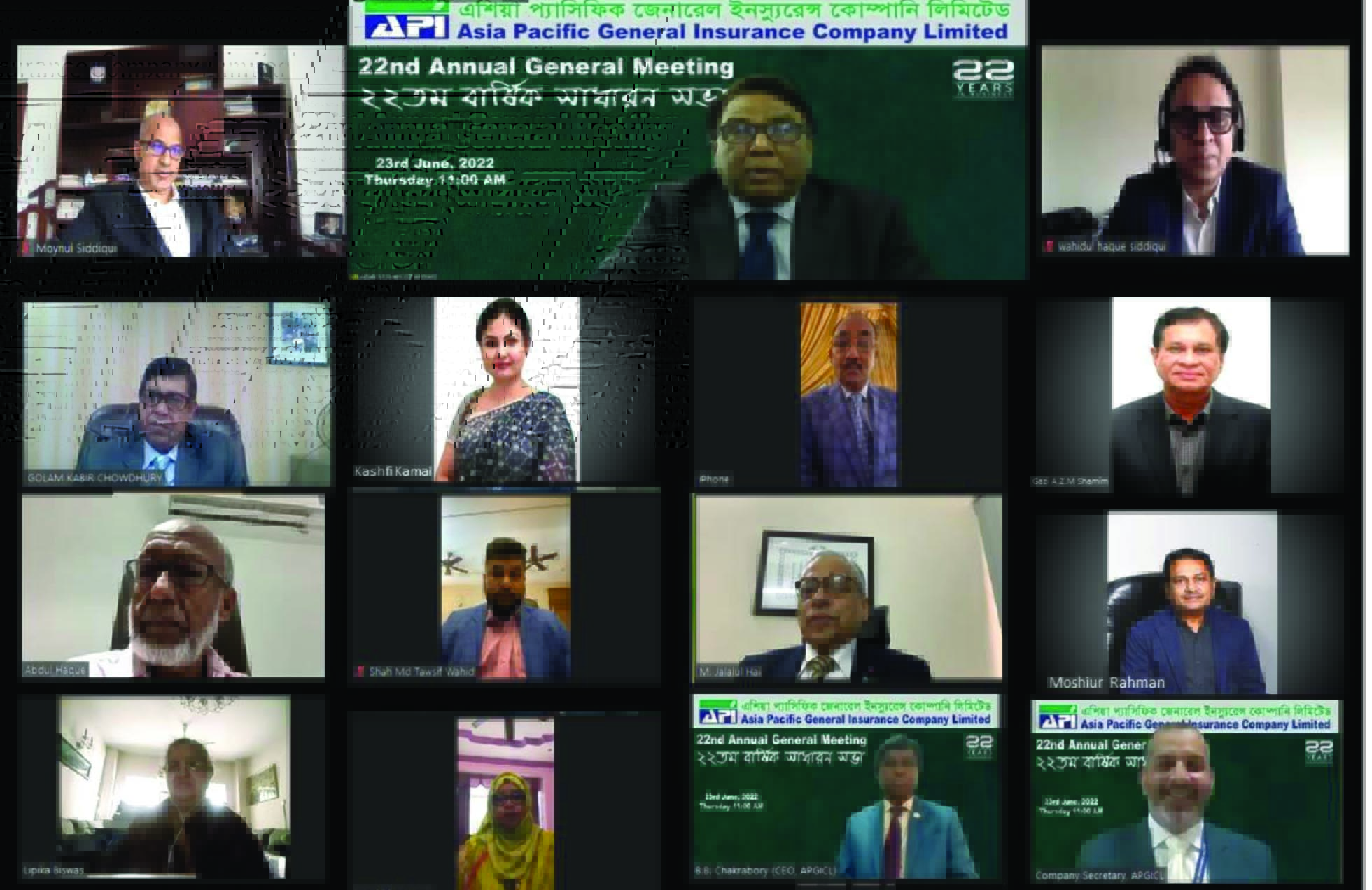 এশিয়া প্যাসিফিক জেনারেল ইন্স্যুরেন্স কোম্পানি লিমিটেড এর “২২তম বার্ষিক সাধারন সভা” (২০২১ হিসাব বৎসরের) ২৩ই জুন, ২০২২ ইং তারিখে অনলাইনের মাধ্যমে কোম্পানীর চেয়ারম্যান জনাব আফতাব উল ইসলাম, এফ সি এ এর সভাপতিত্বে অনুষ্ঠিত হয়। সভায় কোম্পানীর পরিচালনা পর্ষদের সদস্য মিস কাশফী কামাল, জনার ওয়াহিদুল হক সিদ্দীকি, জনাব গাজী এ.জেড.এম. শামীম, জনাব মইনুল হক সিদ্দিকী, জনাব শাহজাহান মিঞাঁ, জনাব আব্দুল হক, জনাব গোলাম কবীর চৌধুরী, জনাব শাহ মোঃ তৌসিফ ওয়াহিদ অনাবিল,