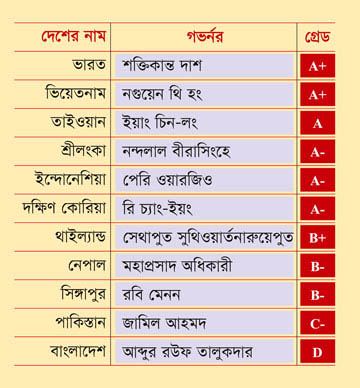 এতে দেখা যায়, এশিয়ায় গভর্নরদের মধ্যে সেরাদের সেরা বা ‘‌এ প্লাস’ গ্রেড পাওয়া দুই গভর্নর হলেন প্রতিবেশী দেশ ভারতের রিজার্ভ ব্যাংক অব ইন্ডিয়ার (আরবিআই) গভর্নর শক্তিকান্ত দাশ ও ভিয়েতনামের কেন্দ্রীয় ব্যাংকের গভর্নর নগুয়েন থি হং। দক্ষিণ এশিয়ায় শ্রীলংকার কেন্দ্রীয় ব্যাংকের গভর্নর নন্দলাল বীরাসিংহে ‘এ মাইনাস’ গ্রেড পেয়েছেন। আর নেপালের কেন্দ্রীয় ব্যাংকের গভর্নর মহাপ্রসাদ অধিকারী পেয়েছেন ‘বি মাইনাস’ গ্রেড। মূল্যস্ফীতিসহ ভয়াবহ সংকটে থাকা পাকিস্তানের কেন্দ্রীয় ব্যাংকের গভর্নর জামিল আহমদ পেয়েছেন ‘সি মাইনাস’।
