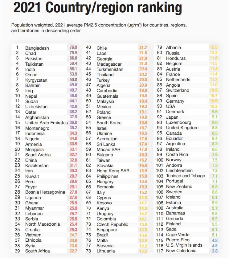 বাংলাদেশের বাতাসে পিএম২.৫ এর গড় পরিমাণ ছিল ৭৬ দশমিক ৯ মাইক্রোগ্রাম, যা সমীক্ষার ১১৭টি দেশ ও অঞ্চলের মধ্যে সবচেয়ে বেশি। এই হিসেবে গতবছর বিশ্বে বাংলাদেশের বাতাসই ছিল সবচেয়ে দূষিত।