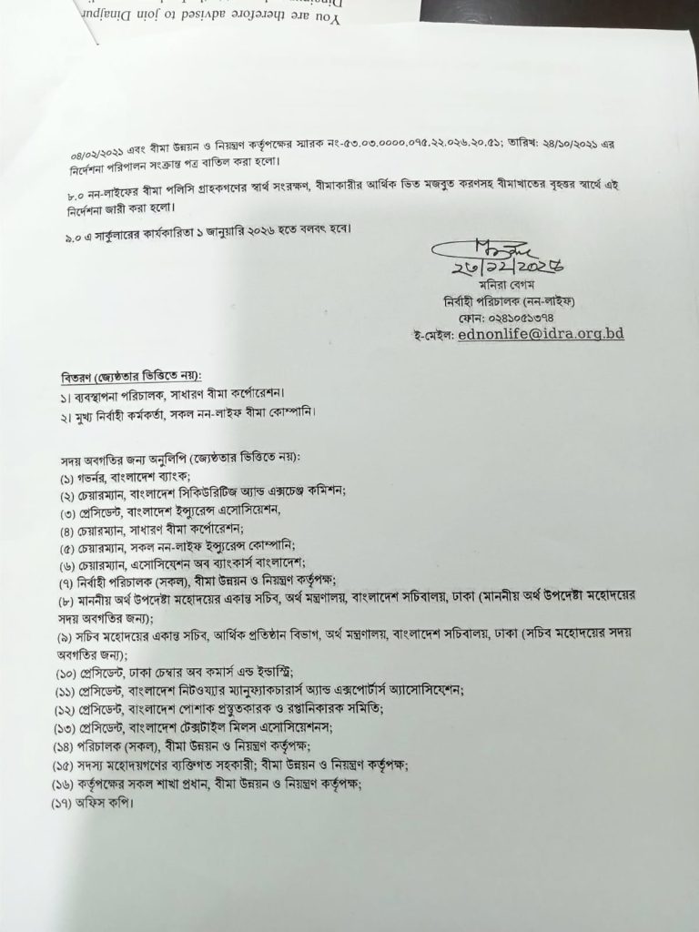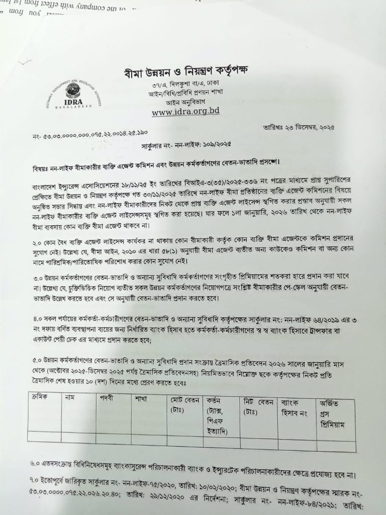 নন-লাইফ বীমা খাতে শৃঙ্খলা ফেরাতে, স্বচ্ছতা বৃদ্ধি এবং পেশাদারিত্ব নিশ্চিত করতে ব্যক্তি এজেন্ট নিয়োগ, কমিশন প্রদান এবং উন্নয়ন কর্মকর্তাদের বেতন-ভাতা সংক্রান্ত নতুন প্রজ্ঞাপন (নন-লাইফ:১০৯/২০২৫) জারি করেছে বীমা উন্নয়ন ও নিয়ন্ত্রণ কর্তৃপক্ষ (আইডিআরএ)। মঙ্গলবার (২৩ ডিসেম্বর) আইডিআরএ’র নির্বাহী পরিচালক (নন-লাইফ) মনিরা বেগম স্বাক্ষরিত এক প্রজ্ঞাপনে এসব সিদ্ধান্ত জানানো হয়। প্রজ্ঞাপনটি আগামী ১ জানুয়ারি ২০২৬ থেকে কার্যকর হবে।