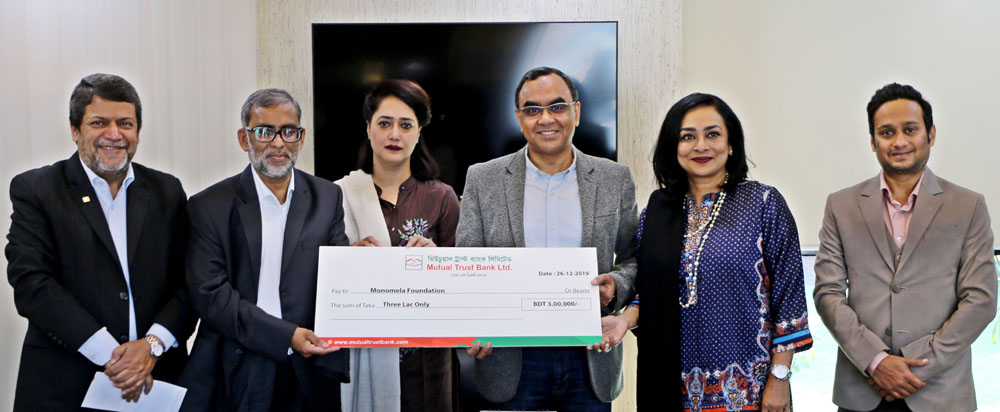 MTB Foundation recently handed over BDT 300,000 to Monomela Foundation to support their endeavors such as free after-school education programmes for the underprivileged children, providing basic medical treatment through free health camps, arranging training programmes on organic agriculture for farmers and many other philanthropic projects. Syed Mahbubur Rahman, Managing Director & CEO, MTB, handed over the cheque to Md. Abdur Rahim, Founder, Monomela Foundation, at a simple ceremony held at the Corporate Head Office of Mutual Trust Bank Limited (MTB), Gulshan 1, Dhaka 1212. Corovi Mizan, Co-Founder, Sazzadul Islam Chowdhury, Co-ordinator of Monomela Foundation and Azam Khan, Group Chief Communications Officer and Samia Chowdhury, Deputy Head, Group Communications of MTB along with other officials of both the organizations were also present at the occasion.