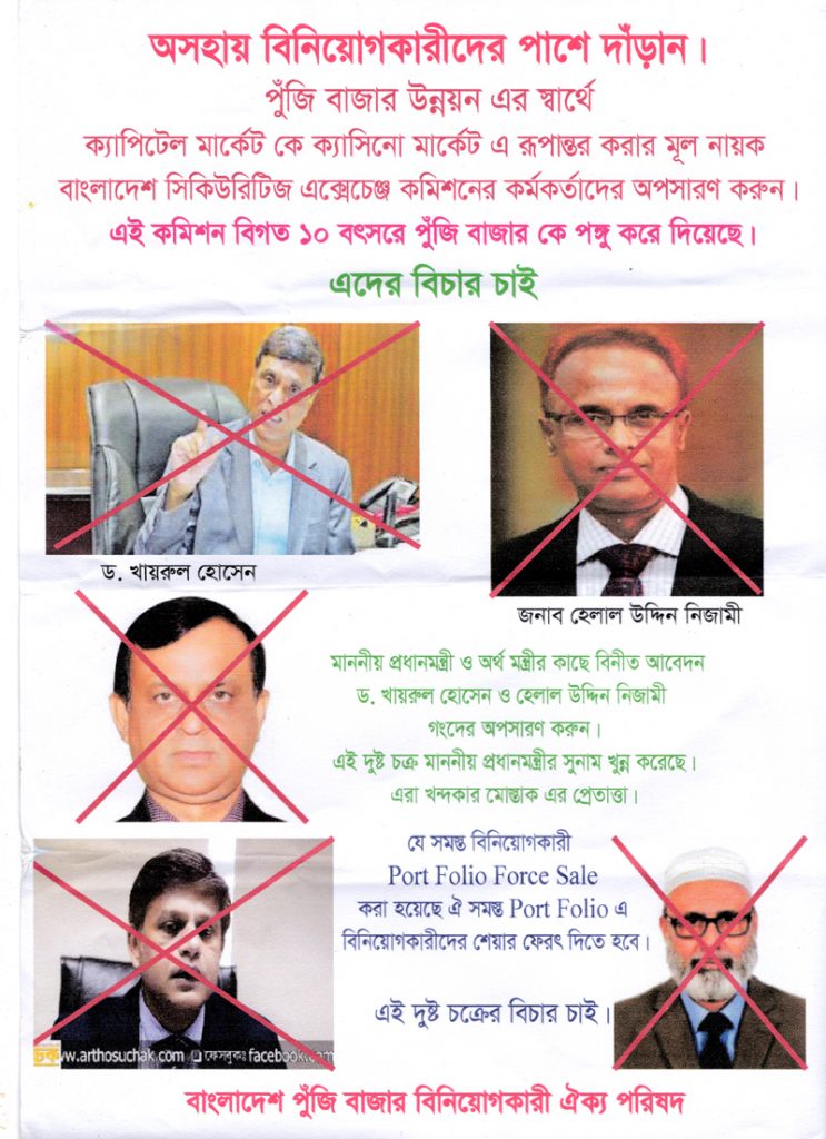 লুটপাট, অর্থপাচার, আর্থীক অনিরাপত্তা ও দরপতনের কারনে ভঙ্গুর প্রায় দেশের শেয়ারবাজার, স্লো পয়জনিং ভাবে নিশ্ব হতে হতে বিনিয়োগকারীদের অবস্থা এখন লাইফ সাফোর্ট দেওয়া আই সি ইউ তে জীবন মৃত্যুর সন্দিক্ষনে থাকা অভিবাবকহীন রুগির মতই, ফিরে দেখার কেউ নাই। ২০১০ সালের ৬ ডিসেম্ভর হঠাৎ করেই তুঙ্গেউঠা পুঁজিবাজার একদিনেই ৬০০ পয়েন্ট সূচক কমার মধ্যদিয়ে পতনের যে ধারাবাহীকতার শুরু হয়েছে তা আজ পর্যন্ত ঘুরে দাঁড়ানের কোন অবস্থানে আসতে পারে নাই। ঊন্নয়নের ডামাঢোল বাজানো বর্তমান সরকারের তৃতিয় মেয়াদে ক্ষমতায় আসার টানা ১০ বছরেরও বেশী অতিক্রান্ত হওয়ার পরও আজ পর্যন্ত শেয়ারবাজার অভিবাবকহীন ভাবে বিনিয়োগকারীদের পথে বসিয়েছে, অদুরদর্ষীতা, অযোগ্য পদাধীকার, জবাবদিহীতার অভাব, অর্থপাচার, লুটপাটের বিচার না হওয়া, বাজার মনিটরিং এর ব্যাবস্থা না থাকা, এবং কোম্পানীর পরিচালকদের নিতিহীন সেচ্ছাচারিতার কারনেই ধারাবাহীকভাবে শেয়ারবাজার আজ মৃতপ্রায় তা অস্বিকার করার কোন উপায় নাই। ১৯৯৬ সালের সরকারে আমলে প্রথম শেয়ার বাজার লুট শুরু হয়, সেই লুটপাটের সঠিক বিচার না হওয়ার কারনে লুটপাট কারিরা আরো বেপরোয়া হয়ে উঠে। অনেকের মতে সরকারের ভিতর গাফটি মেরে থাকা লুটপাট ও অর্থপাচার কারিরা রেজুড়বিত্তির মাধ্যমে সরকারের ভিতর আরেকটি অদৃশ্য সরকার তৈরি মধ্যদিয়ে এহেন অপকর্ম করে প্রশাসন এবং দেশের বিচার ব্যাবস্থাকে বৃদ্ধাঙ্গুলি দেখিয়ে স্বিয় রামরাজ্য প্রতিষ্টার মাধ্যমে বিনিয়োগ কারিদের নিশ্ব করে নিজেদের স্বার্থ হাসিল করে বসে আছে। শেয়ার বাজার নিয়ে সরকার ও মাননীয় প্রধানমন্ত্রীর দেয় প্রনোদনা ও নির্দেশনাকে কোরকম পাত্তা নাদিয়ে নিজেদের স্বকীয়তা রক্ষাকরে চলেছেন। যে কারনে সরকারের বিভিন্ন সময়ে দেওয়া বিভিন্ন প্রনোদনা ও নির্দেশনা থেকে শুরুকরে বিভিন্ন সময়ের আত্মত্যাগ, সংগ্রাম, অবরোধ, মানববন্ধন আজ পর্যন্ত বিনিয়োগ কারীদের কোন কাজে আসেনাই। বি এস ই সি কর্মকর্তা ড. খায়রুল হোসেন স্বীয় আসনে অধিষ্টিত হওয়ার পুর্বমুহুর্তে বলেছিলেন তিনমাসে বাজার ঠিক করে ফেলবেন নাহয় পদত্যাগ করাসহ বিভিন্ন প্রতিশ্রুতি দেন, কিন্তুু তিনমাস তো দুরের কথা প্রায় দশ বছরে বড়বড় বুলি ছাড়া আর কিছুই করতে পারেন নাই এবং বহাল তবিয়তেই আছেন। এমতাবস্থায় ‘বাংলাদেশ পুঁজি বাজার বিনিয়োগকারী ঐক্য পরিষদ’সহ বিনিয়োগকারিরা মাননীয় প্রধানমন্ত্রী ও অর্থমন্ত্রীর হস্তক্ষেপ কামনাকরে বাজার রক্ষার শেষ উপায় হিসাবে বি এস ই সির চেয়ারম্যান সহ বেশকজন কর্মকর্তাও কিছু দুষ্টচক্রের অপসারন চেয়ে ছবি সম্বলিত একটি লিপলেট বিতরন করেন,যা স্কেন করে হুবহু তুলে দেওয়া হলো।