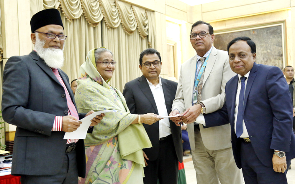 Prime Minister Sheikh Hasina receives a cheque for Tk 1 crore from South Bangla Agriculture and Commerce Bank Chairman S.M. Amzad Hossain as donation to the Jatir Janak Bangabandhu Sheikh Mujibur Rahman Memorial Trust to celebrate the 100th birth anniversary of the Father of the Nation as Mujib Year, at a program at GonoBhaban in Dhaka on Monday January 6, 2020. While Finance Minister AHM Mustafa Kamal, BAB Chairman Nazrul Islam Majumdar, SBAC Bank Managing Director & CEO Md. Golam Faruque were present in the program.