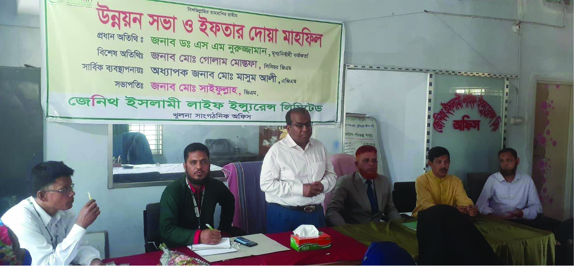 ০৮ এপ্রিল ২০২৩ শনিবার খুলনায় জেনিথ ইসলামী লাইফ ইন্স্যুরেন্স লিমিটেড এর শিরোমনি এজেন্সি অফিসের উদ্যোগে উন্নয়ন সভা, ইফতার ও দোয়া মাহফিল অনুষ্ঠিত হয়। সভায় প্রধান অতিথি হিসেবে উপস্থিত থেকে দিক নির্দেশনামূলক বক্তব্য রাখেন কোম্পানীর মুখ্য নির্বাহী কর্মকর্তা ও বাংলাদেশ ইন্স্যুরেন্স ফোরামের ভারপ্রাপ্ত সেক্রেটারী জেনারেল এস এম নুরুজ্জামান। বিশেষ অতিথি হিসেবে উপস্থিত ছিলেন সংগঠন প্রধান ও সিনিয়র জেনারেল ম্যানেজার মোঃ গোলাম মোস্তফা, ইভিপি ও প্রশিক্ষক মোঃ মজিবুল মাওলা লিটন। সার্বিক ব্যবস্থাপনায় ছিলেন অধ্যাপক ও এজিএম মোঃ মাসুম আলী।